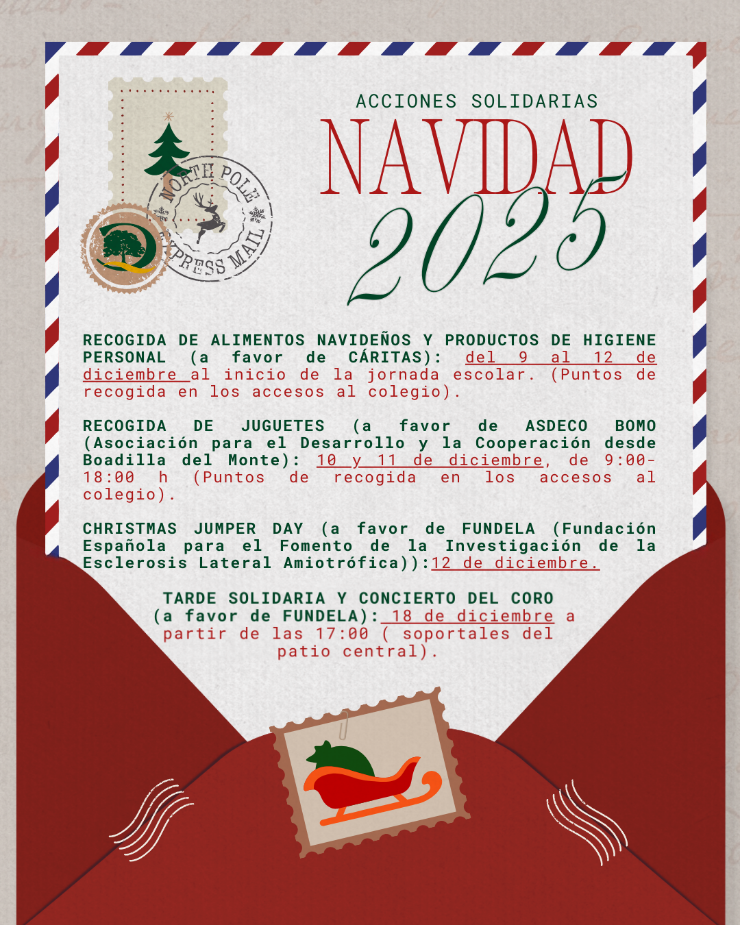 • Christmas Jumper Day (a favor de FUNDELA (Fundación Española para el Fomento de la Investigación de la Esclerosis Lateral Amiotrófica): el viernes 12 de diciembre, todo el alumnado está invitado a venir al cole con ropa de calle y con algún detalle navideño. Durante esta jornada, se podrán dejar los donativos en las diferentes huchas disponibles en las aulas (las familias de infantil podrán hacerlo en las huchas que colocaremos en las puertas de entrada).