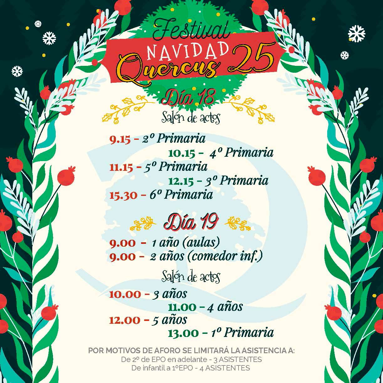 El primero de estos festivales, el del 18 de diciembre, será el de nuestros chicos y chicas de Primaria (desde 2º hasta 6ª). Desde las 9:15 y en franjas de 1 hora, este alumnado mostrará a sus familias sus dotes más artísticas en un mañana que se organizará de la siguiente manera: